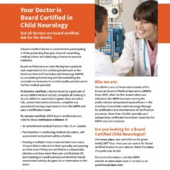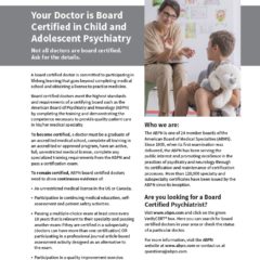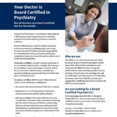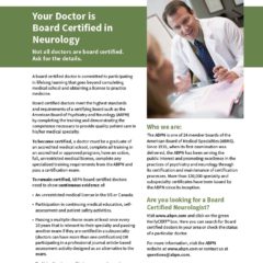 ABPN now offers free one-page patient flyers for board-certified psychiatrists, neurologists, child neurologists and child and adolescent psychiatrists to download and use in an office setting. The flyers stress the importance of partnering with a board-certified physician and outline the steps physicians take to become certified and maintain that certification throughout one’s professional life. Feel free to distribute these flyers to your patients.